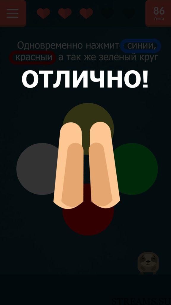 Одновременно нажмите синий, красный, а также зеленый круг. 39 уровень Каверзный тест (Tricky test) — игра от разработчиков студии NatGames. Если вам надоели наивные и простые задачки и головоломки, то эта игра определенно для вас! Нужно будет трясти, переворачивать, гладить свой телефон, чтобы пройти уровень. В описании игры написано, что 94% скачавших, не пройдут игру с первого раза. Чтобы исправить этот процент в меньшую сторону, мы предоставляем вам ответы на все уровни игры.