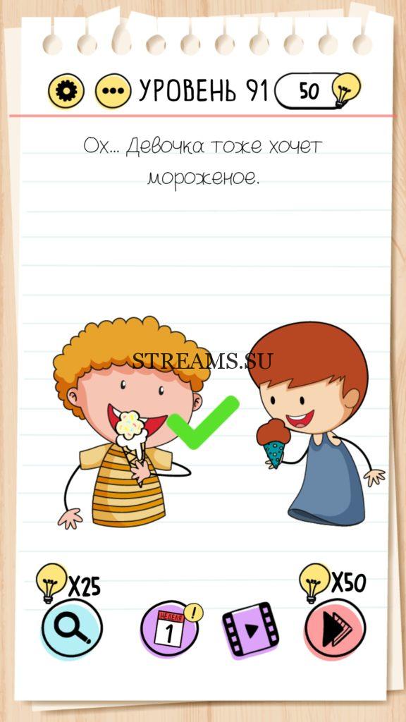 Ох… Девочка тоже хочет мороженое. Уровень 91 — Brain Test — Это самая популярная головоломка, в которой вам предстоит разгадывать непростые задачки. Нужно будет искать нестандартные решения. Название игры говорит само за себя (Тест мозга). С её помощью вы сможете повысить свой IQ, и интеллект. Иногда ответ может быть очень прост. Вы можете играть в компании друзей или родных. Брейн Тест, это отличный способ провести время с пользой и узнать насколько ты умный. Но если вы не можете решить один или несколько уровней, то воспользуйтесь подсказками с нашего сайта.