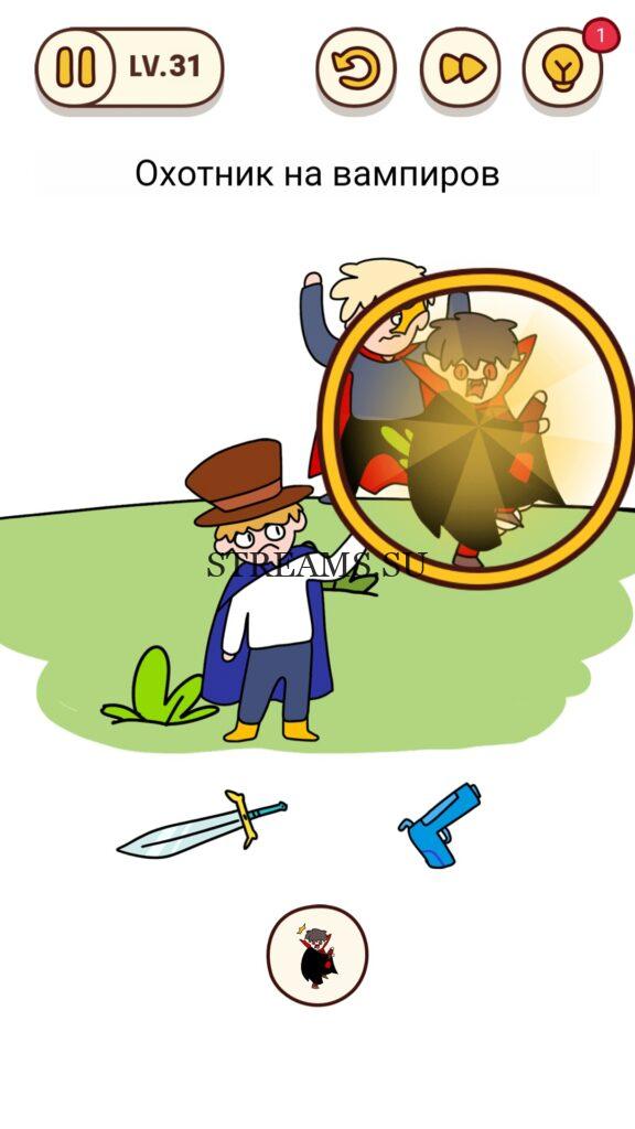 Охотник на вампиров. Уровень 31 — Brain Find– игра для любителей подумать над интересными задачами, ответ на этот уровень находится чуть ниже. Нужно включить собственное остроумие. Эта игра дает возможность увидеть множество локаций и разгадать бесконечное количество ребусов. Каждый отличается друг от друга. Создатели игры – «Focus apps» вложили не только материальные средства, но и всю любовь к игрокам. Ведь в приложении достаточно совершенная прорисовка, радующая глаз. Главным преимуществом является поддержка как Android так и IOS. Нередко бывает, что человек, проходящий уровень, не способен его решить (задача слишком сложна или непонятна). Наш сайт с ответами поможет игроку достичь вершин рейтинга и заполучить все бонусы.