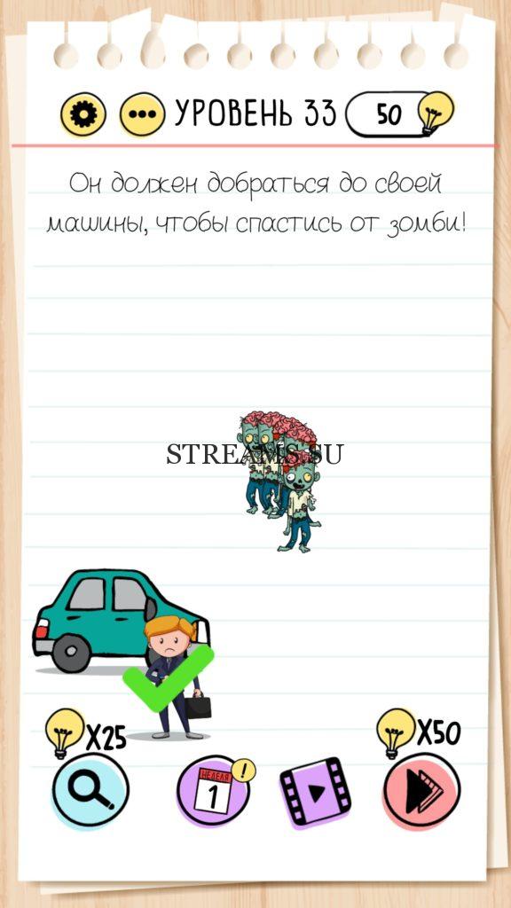 Он должен добраться до своей машины, чтобы спастись от зомби! Уровень 33 — Brain Test — Это самая популярная головоломка, в которой вам предстоит разгадывать непростые задачки. Нужно будет искать нестандартные решения. Название игры говорит само за себя (Тест мозга). С её помощью вы сможете повысить свой IQ, и интеллект. Иногда ответ может быть очень прост. Вы можете играть в компании друзей или родных. Брейн Тест, это отличный способ провести время с пользой и узнать насколько ты умный. Но если вы не можете решить один или несколько уровней, то воспользуйтесь подсказками с нашего сайта.