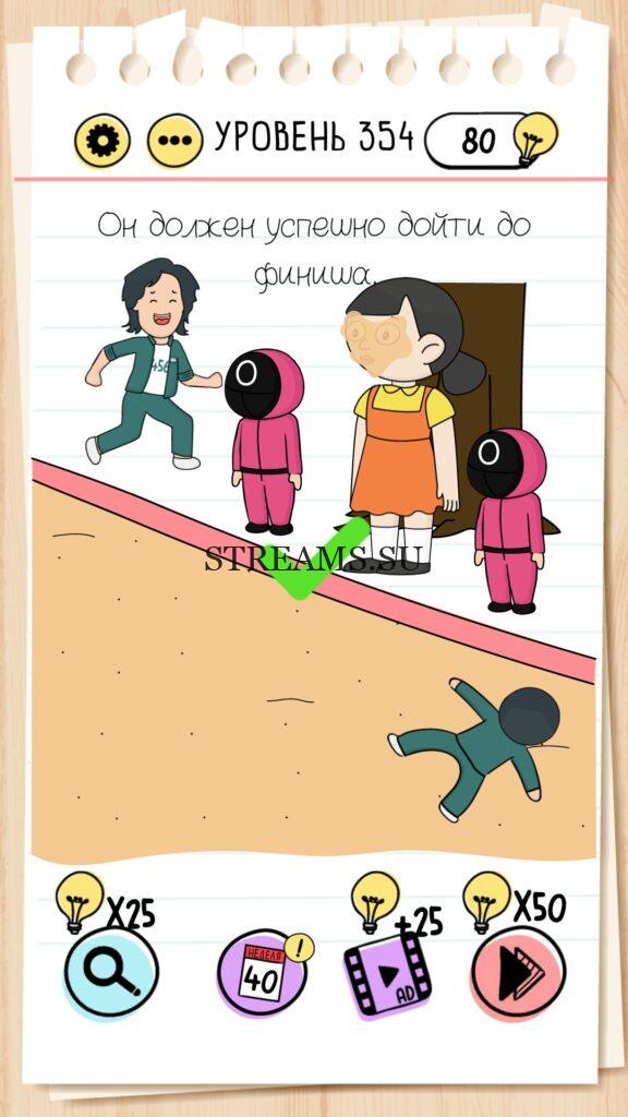 Он должен успешно дойти до финиша. Уровень 354 — Brain Test — Это самая популярная головоломка, в которой вам предстоит разгадывать непростые задачки. Нужно будет искать нестандартные решения. Название игры говорит само за себя (Тест мозга). С её помощью вы сможете повысить свой IQ, и интеллект. Иногда ответ может быть очень прост. Вы можете играть в компании друзей или родных. Брейн Тест, это отличный способ провести время с пользой и узнать насколько ты умный. Но если вы не можете решить один или несколько уровней, то воспользуйтесь подсказками с нашего сайта.