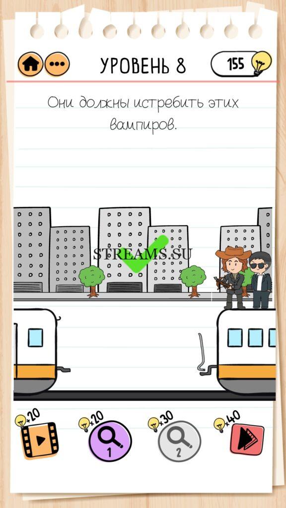 Они должны истребить этих вампиров. Уровень 8 — Brain Test 2 (Беймс Джонд и Ваня. Часть 2): Вторая часть замечательной игры уже здесь. Готовы к испытанию своего мозга на прочность? Тогда смело залетайте в эту головоломку. Здесь нас ждет непредсказуемые задачки, вопросы и головоломки, которые сразу и не получиться решить. Будьте готовы к вопросам с подвохом! Попробуйте решить все уровни. Эта головоломка построена по принципу историй. В каждой истории придется помогать кому-то решить бытовые вопросы; вычислить преступника; помочь похудеть. Это лишь некоторые эпизоды которые нас ожидают в этой игре. Очень красочная игра, которая понравится и вам и вашим друзьям. Если не получается пройти загадку, то на нашем сайте STREAMS.SU вы найдете решение любого уровня Brain Test 2!