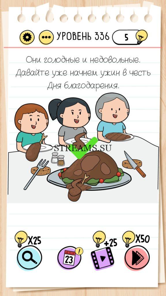 Они голодные и недовольные. Давайте уже начнем ужин в честь Дня благодарения. Уровень 336 — Brain Test — Это самая популярная головоломка, в которой вам предстоит разгадывать непростые задачки. Нужно будет искать нестандартные решения. Название игры говорит само за себя (Тест мозга). С её помощью вы сможете повысить свой IQ, и интеллект. Иногда ответ может быть очень прост. Вы можете играть в компании друзей или родных. Брейн Тест, это отличный способ провести время с пользой и узнать насколько ты умный. Но если вы не можете решить один или несколько уровней, то воспользуйтесь подсказками с нашего сайта.
