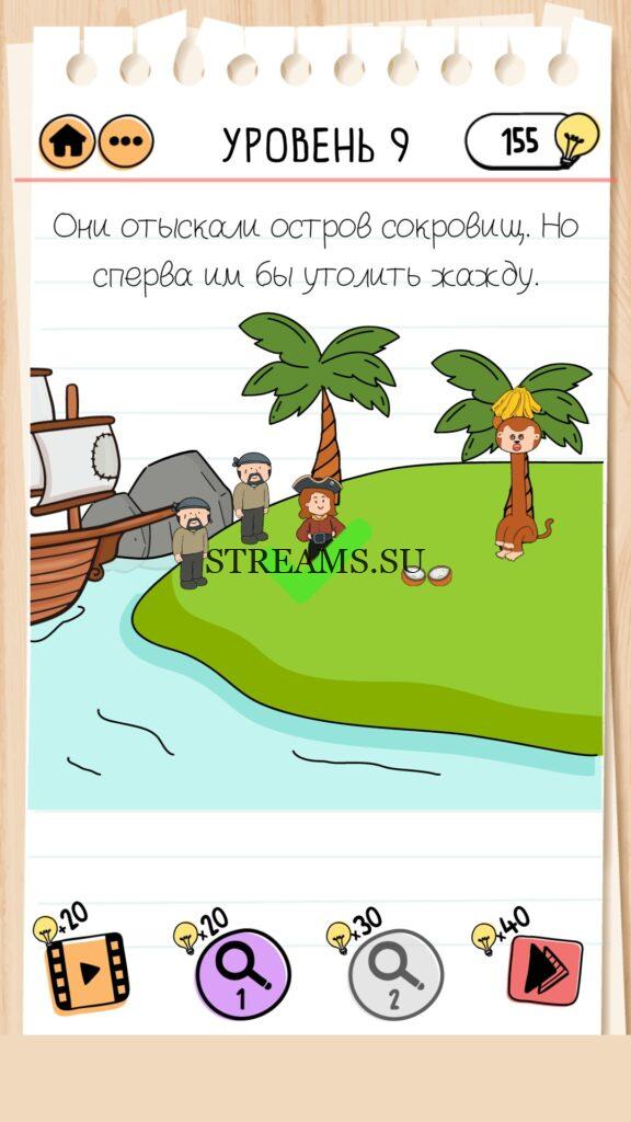 Они отыскали остров сокровищ. Но сперва им бы утолить жажду. Уровень 9 — Brain Test 2 (Капитан Маша): Вторая часть замечательной игры уже здесь. Готовы к испытанию своего мозга на прочность? Тогда смело залетайте в эту головоломку. Здесь нас ждет непредсказуемые задачки, вопросы и головоломки, которые сразу и не получиться решить. Будьте готовы к вопросам с подвохом! Попробуйте решить все уровни. Эта головоломка построена по принципу историй. В каждой истории придется помогать кому-то решить бытовые вопросы; вычислить преступника; помочь похудеть. Это лишь некоторые эпизоды которые нас ожидают в этой игре. Очень красочная игра, которая понравится и вам и вашим друзьям. Если не получается пройти загадку, то на нашем сайте STREAMS.SU вы найдете решение любого уровня Brain Test 2!