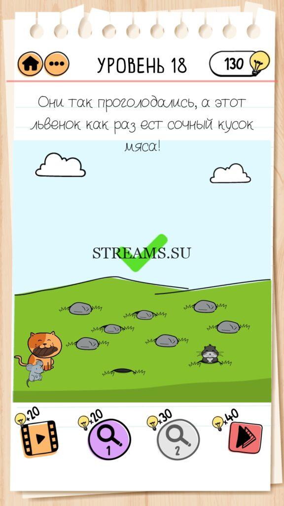 Они так проголодались, а этот львенок как раз есть сочный кусок мясо. Уровень 18 — Brain Test 2 (Приключения Васьки): Вторая часть замечательной игры уже здесь. Готовы к испытанию своего мозга на прочность? Тогда смело залетайте в эту головоломку. Здесь нас ждет непредсказуемые задачки, вопросы и головоломки, которые сразу и не получиться решить. Будьте готовы к вопросам с подвохом! Попробуйте решить все уровни. Эта головоломка построена по принципу историй. В каждой истории придется помогать кому-то решить бытовые вопросы; вычислить преступника; помочь похудеть. Это лишь некоторые эпизоды которые нас ожидают в этой игре. Очень красочная игра, которая понравится и вам и вашим друзьям. Если не получается пройти загадку, то на нашем сайте STREAMS.SU вы найдете решение любого уровня Brain Test 2!