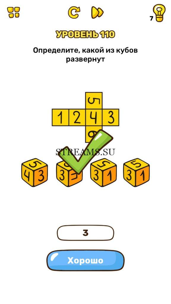 Определите, какой из кубов развернут. Уровень 110 — Brain Blow: Тест на гениальность — Ответ на этот уровень находится под фото. Очередная игра от популярных разработчиков головоломок CASUAL AZUR GAMES. Если вы хотите взорвать свой мозг и развить навыки нестандартного мышления, тогда игра Брейн Блоу определенно вам понравится. Если не получается решить задание, то попробуйте включить нестандартное мышление, тряхнуть телефон, погладить его или использовать больше пальцев. Эта игра способна развить в вас навыки следопыта, креативность и прокачать ваш IQ. Но, а если все-же не получается пройти уровень, найдите правильное решение на нашем сайте.