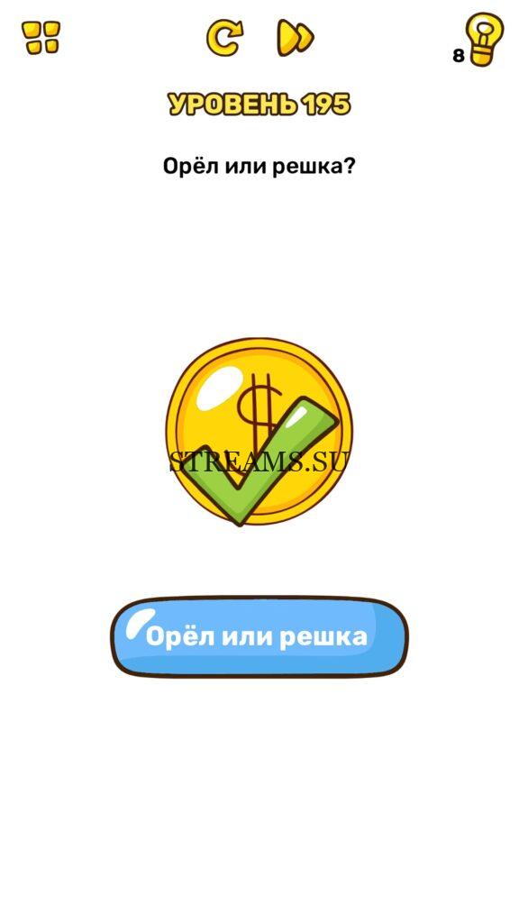 Орёл или решка? Уровень 195 — Brain Blow: Тест на гениальность — Ответ на этот уровень находится под фото. Очередная игра от популярных разработчиков головоломок CASUAL AZUR GAMES. Если вы хотите взорвать свой мозг и развить навыки нестандартного мышления, тогда игра Брейн Блоу определенно вам понравится. Если не получается решить задание, то попробуйте включить нестандартное мышление, тряхнуть телефон, погладить его или использовать больше пальцев. Эта игра способна развить в вас навыки следопыта, креативность и прокачать ваш IQ. Но, а если все-же не получается пройти уровень, найдите правильное решение на нашем сайте.
