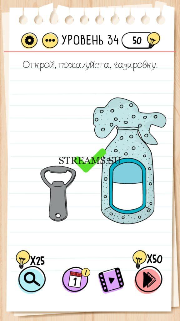 Открой, пожалуйста, газировку. Уровень 34 — Brain Test — Это самая популярная головоломка, в которой вам предстоит разгадывать непростые задачки. Нужно будет искать нестандартные решения. Название игры говорит само за себя (Тест мозга). С её помощью вы сможете повысить свой IQ, и интеллект. Иногда ответ может быть очень прост. Вы можете играть в компании друзей или родных. Брейн Тест, это отличный способ провести время с пользой и узнать насколько ты умный. Но если вы не можете решить один или несколько уровней, то воспользуйтесь подсказками с нашего сайта.