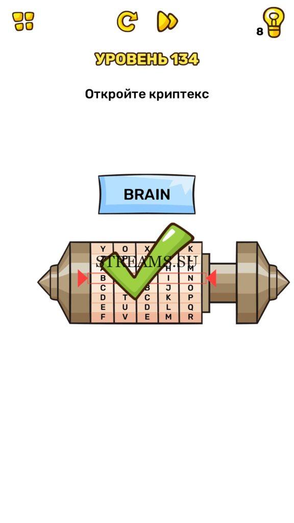 Откройте криптекс. Уровень 134 — Brain Blow: Тест на гениальность — Ответ на этот уровень находится под фото. Очередная игра от популярных разработчиков головоломок CASUAL AZUR GAMES. Если вы хотите взорвать свой мозг и развить навыки нестандартного мышления, тогда игра Брейн Блоу определенно вам понравится. Если не получается решить задание, то попробуйте включить нестандартное мышление, тряхнуть телефон, погладить его или использовать больше пальцев. Эта игра способна развить в вас навыки следопыта, креативность и прокачать ваш IQ. Но, а если все-же не получается пройти уровень, найдите правильное решение на нашем сайте.