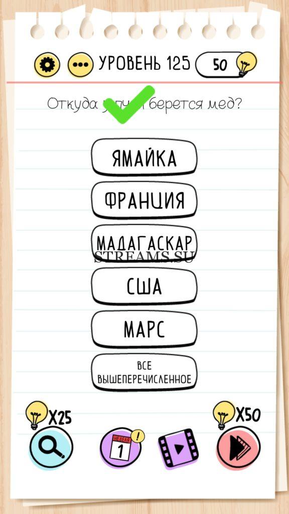 Откуда у пчел берется мед? Уровень 125 — Brain Test— Это самая популярная головоломка, в которой вам предстоит разгадывать непростые задачки. Нужно будет искать нестандартные решения. Название игры говорит само за себя (Тест мозга). С её помощью вы сможете повысить свой IQ, и интеллект. Иногда ответ может быть очень прост. Вы можете играть в компании друзей или родных. Брейн Тест, это отличный способ провести время с пользой и узнать насколько ты умный. Но если вы не можете решить один или несколько уровней, то воспользуйтесь подсказками с нашего сайта.