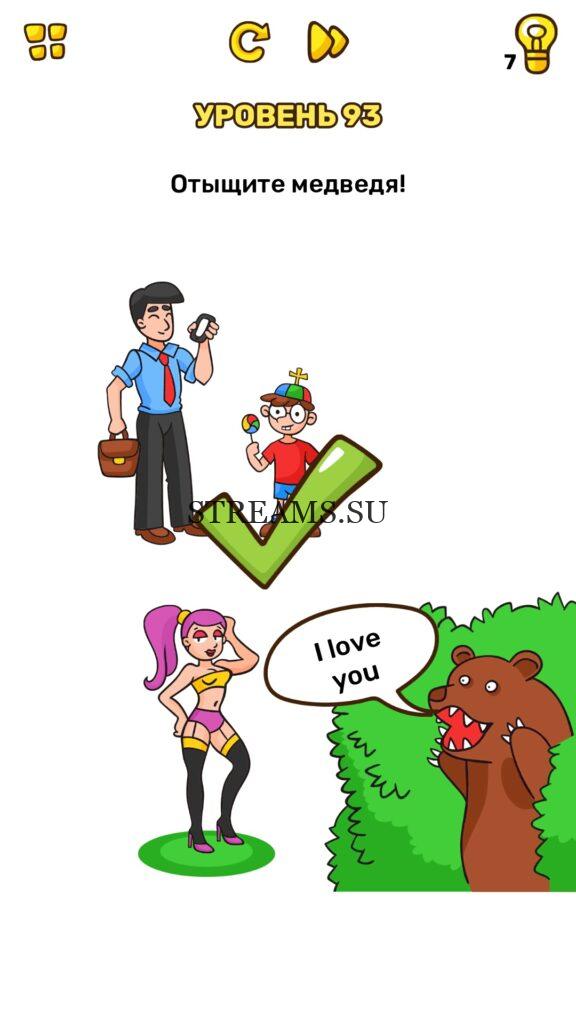 Отыщите медведя! Уровень 93 — Brain Blow: Тест на гениальность — Ответ на этот уровень находится под фото. Очередная игра от популярных разработчиков головоломок CASUAL AZUR GAMES. Если вы хотите взорвать свой мозг и развить навыки нестандартного мышления, тогда игра Брейн Блоу определенно вам понравится. Если не получается решить задание, то попробуйте включить нестандартное мышление, тряхнуть телефон, погладить его или использовать больше пальцев. Эта игра способна развить в вас навыки следопыта, креативность и прокачать ваш IQ. Но, а если все-же не получается пройти уровень, найдите правильное решение на нашем сайте.