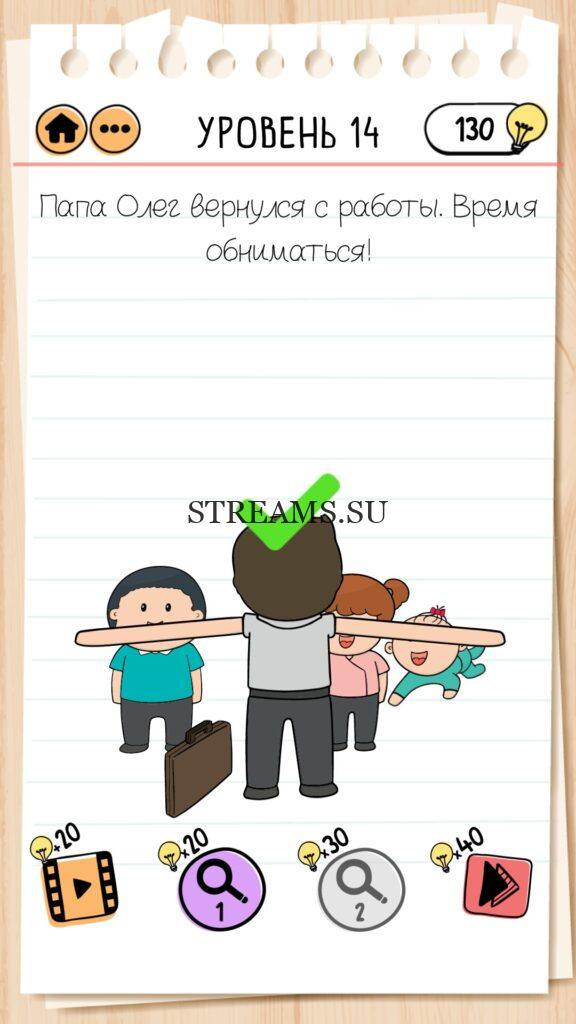 Папа Олег вернулся с работы. Время обниматься! Уровень 14 — Brain Test 2 (Семья Всезнайкиных): Вторая часть замечательной игры уже здесь. Готовы к испытанию своего мозга на прочность? Тогда смело залетайте в эту головоломку. Здесь нас ждет непредсказуемые задачки, вопросы и головоломки, которые сразу и не получиться решить. Будьте готовы к вопросам с подвохом! Попробуйте решить все уровни. Эта головоломка построена по принципу историй. В каждой истории придется помогать кому-то решить бытовые вопросы; вычислить преступника; помочь похудеть. Это лишь некоторые эпизоды которые нас ожидают в этой игре. Очень красочная игра, которая понравится и вам и вашим друзьям. Если не получается пройти загадку, то на нашем сайте STREAMS.SU вы найдете решение любого уровня Brain Test 2!