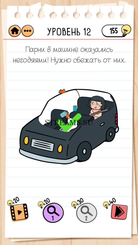 Парни в машине оказались негодяями! Нужно сбежать от них. Уровень 12 — Brain Test 2 (Невезучая Надя): Вторая часть замечательной игры уже здесь. Готовы к испытанию своего мозга на прочность? Тогда смело залетайте в эту головоломку. Здесь нас ждет непредсказуемые задачки, вопросы и головоломки, которые сразу и не получиться решить. Будьте готовы к вопросам с подвохом! Попробуйте решить все уровни. Эта головоломка построена по принципу историй. В каждой истории придется помогать кому-то решить бытовые вопросы; вычислить преступника; помочь похудеть. Это лишь некоторые эпизоды которые нас ожидают в этой игре. Очень красочная игра, которая понравится и вам и вашим друзьям. Если не получается пройти загадку, то на нашем сайте STREAMS.SU вы найдете решение любого уровня Brain Test 2!