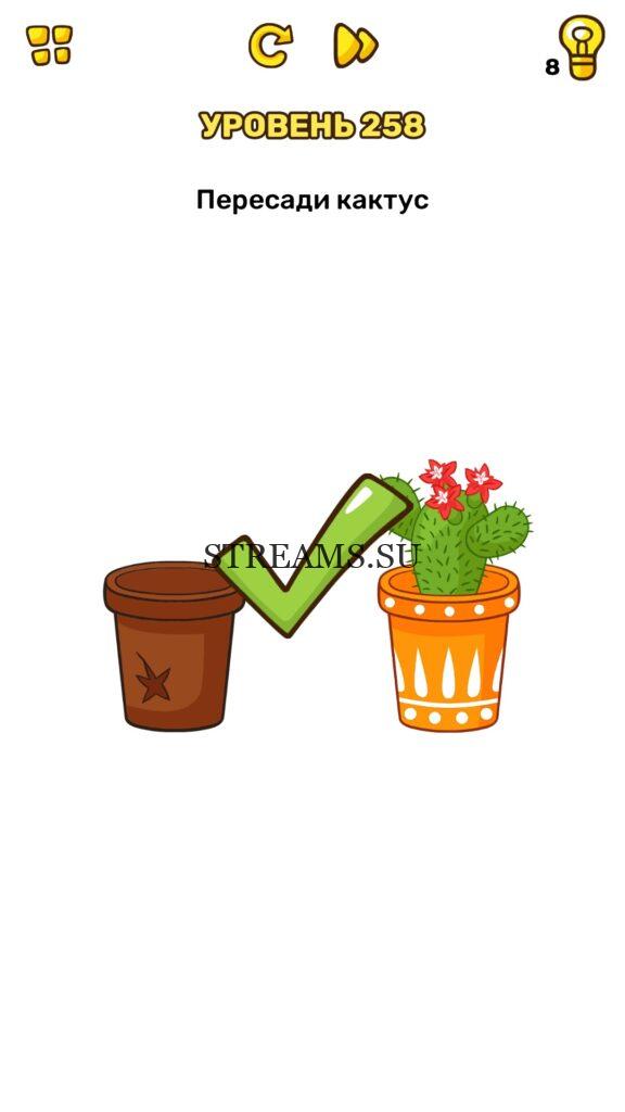 Пересади кактус. Уровень 258 — Brain Blow: Тест на гениальность — Ответ на этот уровень находится под фото. Очередная игра от популярных разработчиков головоломок CASUAL AZUR GAMES. Если вы хотите взорвать свой мозг и развить навыки нестандартного мышления, тогда игра Брейн Блоу определенно вам понравится. Если не получается решить задание, то попробуйте включить нестандартное мышление, тряхнуть телефон, погладить его или использовать больше пальцев. Эта игра способна развить в вас навыки следопыта, креативность и прокачать ваш IQ. Но, а если все-же не получается пройти уровень, найдите правильное решение на нашем сайте.