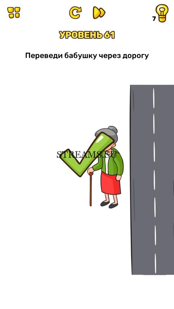 Переведите бабушку через дорогу. Уровень 61 — Brain Blow: Тест на гениальность — Ответ на этот уровень находится под фото. Очередная игра от популярных разработчиков головоломок CASUAL AZUR GAMES. Если вы хотите взорвать свой мозг и развить навыки нестандартного мышления, тогда игра Брейн Блоу определенно вам понравится. Если не получается решить задание, то попробуйте включить нестандартное мышление, тряхнуть телефон, погладить его или использовать больше пальцев. Эта игра способна развить в вас навыки следопыта, креативность и прокачать ваш IQ. Но, а если все-же не получается пройти уровень, найдите правильное решение на нашем сайте.