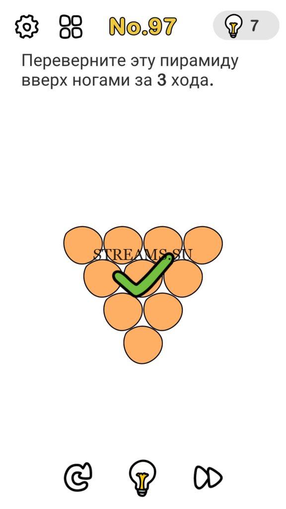Переверните эту пирамиду вверх ногами за 3 хода. Уровень 97 — Brain Out: Ответ на этот уровень находится чуть ниже. Всегда было интересно узнать каков твой IQ? Эта игра поможет тебе узнать ответ на этот вопрос! В ней встречаются как логические загадки, так и не очень. С помощью этой интересной головоломки вы сможете развить нестандартное мышление, креативность, воображение а также улучшить способность запоминать. Некоторые решения задач, могут показаться абсурдными. Играйте в Brain Out с друзьями и родственниками. А если у вас не получается пройти один или несколько уровней, вы можете воспользоваться подсказками с нашего сайта.