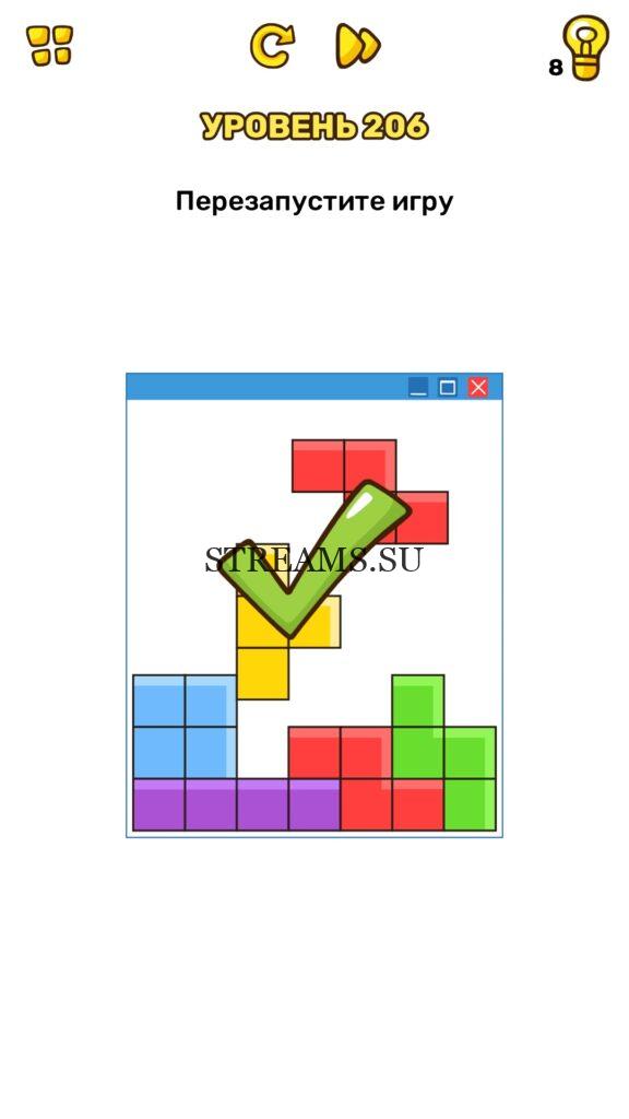 Перезапустите игру. Уровень 206 — Brain Blow: Тест на гениальность — Ответ на этот уровень находится под фото. Очередная игра от популярных разработчиков головоломок CASUAL AZUR GAMES. Если вы хотите взорвать свой мозг и развить навыки нестандартного мышления, тогда игра Брейн Блоу определенно вам понравится. Если не получается решить задание, то попробуйте включить нестандартное мышление, тряхнуть телефон, погладить его или использовать больше пальцев. Эта игра способна развить в вас навыки следопыта, креативность и прокачать ваш IQ. Но, а если все-же не получается пройти уровень, найдите правильное решение на нашем сайте.