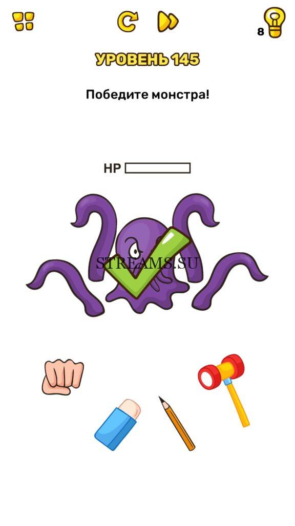 Победите монстра! Уровень 145 — Brain Blow: Тест на гениальность — Ответ на этот уровень находится под фото. Очередная игра от популярных разработчиков головоломок CASUAL AZUR GAMES. Если вы хотите взорвать свой мозг и развить навыки нестандартного мышления, тогда игра Брейн Блоу определенно вам понравится. Если не получается решить задание, то попробуйте включить нестандартное мышление, тряхнуть телефон, погладить его или использовать больше пальцев. Эта игра способна развить в вас навыки следопыта, креативность и прокачать ваш IQ. Но, а если все-же не получается пройти уровень, найдите правильное решение на нашем сайте.