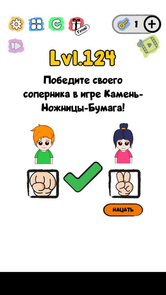 Победите своего соперника в игре Камень-Ножницы-Бумага! 124 уровень Trick Me: логические головоломки — Это игра созданная в виде викторины. Каждый новый уровень отличается от предыдущего, что делает игровой процесс затягивающим и интересным. Если ты хочешь узнать насколько ты умный, тогда эта игра точно для тебя! Trick Me поможет тебе развить нестандартное мышление, и повысить свой IQ. В этой игре уже есть 236 уровней, которые постоянно обновляются и пополняются. Но если застрял на одном или нескольких уровнях, и не можешь их пройти, то наш сайт придет на помощь, у нас есть все ответы на уровни игры Trick Me.