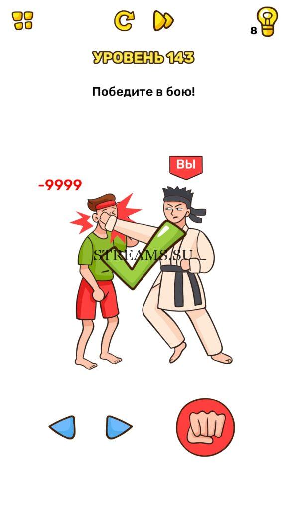 Победите в бою! Уровень 143 — Brain Blow: Тест на гениальность — Ответ на этот уровень находится под фото. Очередная игра от популярных разработчиков головоломок CASUAL AZUR GAMES. Если вы хотите взорвать свой мозг и развить навыки нестандартного мышления, тогда игра Брейн Блоу определенно вам понравится. Если не получается решить задание, то попробуйте включить нестандартное мышление, тряхнуть телефон, погладить его или использовать больше пальцев. Эта игра способна развить в вас навыки следопыта, креативность и прокачать ваш IQ. Но, а если все-же не получается пройти уровень, найдите правильное решение на нашем сайте.