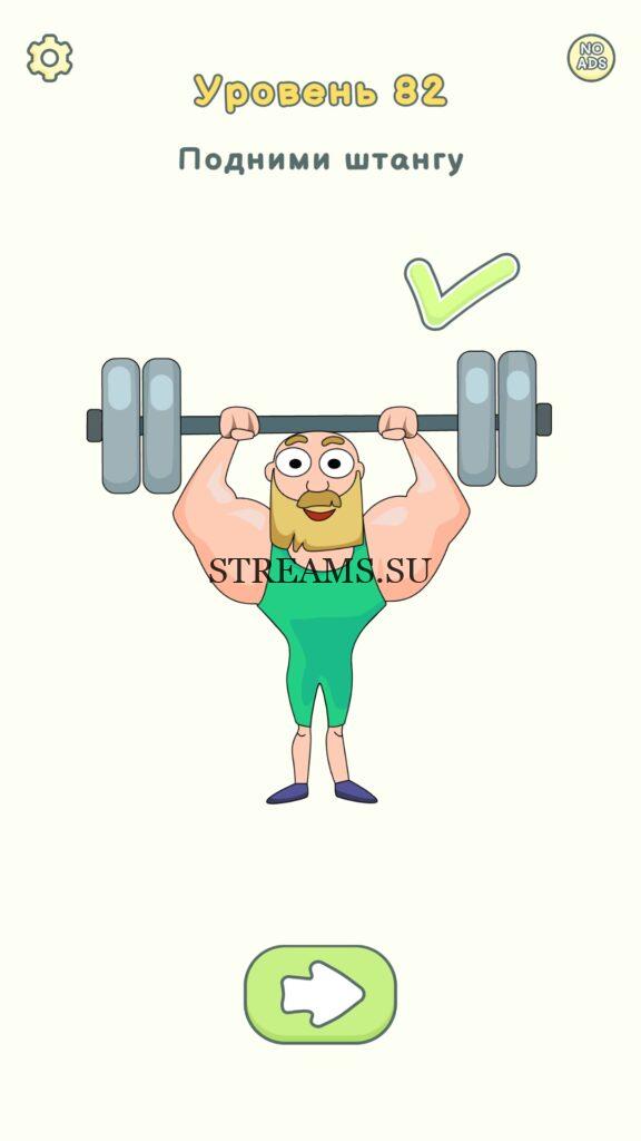 Подними штангу. Уровень 82 — DOP 2: Delete One Part. Вы готовы к продолжению первой части игры? Тогда вперед! Эта игра DOP 2 (Расшифровка: Delete One Part) , которая отличается от первой части тем, что здесь нам нужно будет не дорисовывать предметы, а удалять или стирать их. Вас ждет множество хитроумных и интересных уровней. На первом этапе нам будут подсказывать, что нужно удали, но потом становится всё тяжелее и тяжелее решать головоломки. Разработчики постарались сделать игру привлекательной. Геймплей заставит вас просидеть за игрой очень долго. Красивая графика исполнения. Тренировка мозга и многое другое, всё это ждет нас в замечательной головоломке DOP 2. Если не получается пройти уровень, или зашли в тупик, то вы можете найти ответ на любой уровень на нашем сайте STREAMS.SU! Ответ на этот уровень находиться чуть ниже..