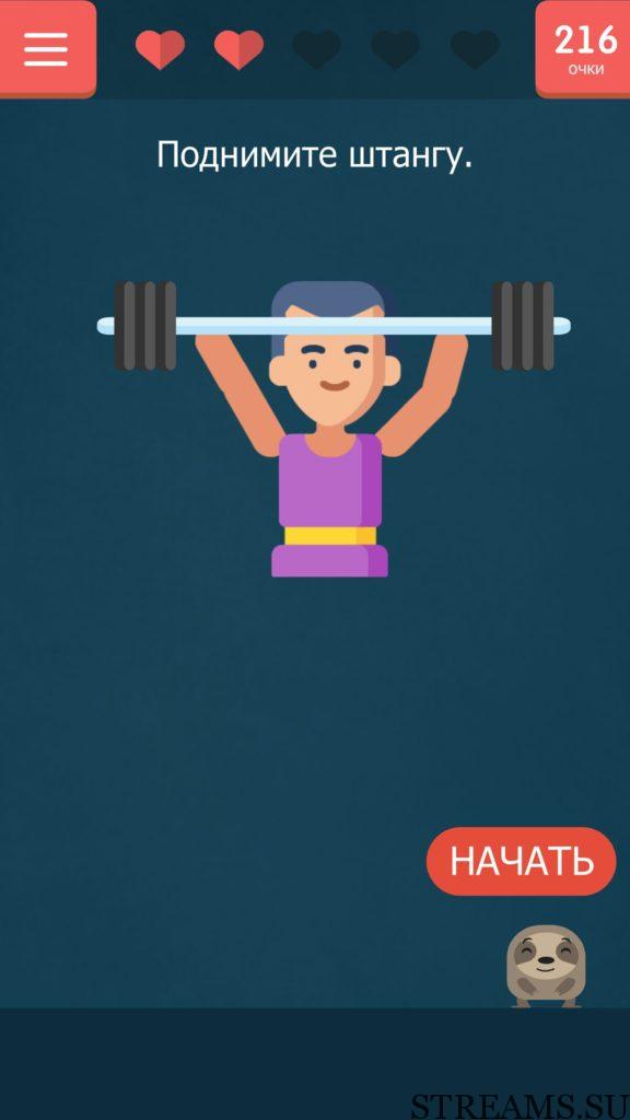 Уберите слово «начать» вправо, за ним спрятались гантели, дайте их атлету, после чего он сможет поднять штангу