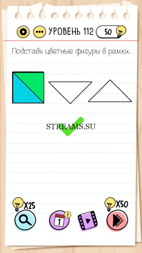 Подставь цветные фигуры в рамки. Уровень 112 — Brain Test — Это самая популярная головоломка, в которой вам предстоит разгадывать непростые задачки. Нужно будет искать нестандартные решения. Название игры говорит само за себя (Тест мозга). С её помощью вы сможете повысить свой IQ, и интеллект. Иногда ответ может быть очень прост. Вы можете играть в компании друзей или родных. Брейн Тест, это отличный способ провести время с пользой и узнать насколько ты умный. Но если вы не можете решить один или несколько уровней, то воспользуйтесь подсказками с нашего сайта.