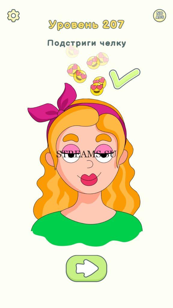 Подстриги челку. Уровень 207 — DOP 2: Delete One Part. Вы готовы к продолжению первой части игры? Тогда вперед! Эта игра DOP 2 (Расшифровка: Delete One Part) , которая отличается от первой части тем, что здесь нам нужно будет не дорисовывать предметы, а удалять или стирать их. Вас ждет множество хитроумных и интересных уровней. На первом этапе нам будут подсказывать, что нужно удали, но потом становится всё тяжелее и тяжелее решать головоломки. Разработчики постарались сделать игру привлекательной. Геймплей заставит вас просидеть за игрой очень долго. Красивая графика исполнения. Тренировка мозга и многое другое, всё это ждет нас в замечательной головоломке DOP 2. Если не получается пройти уровень, или зашли в тупик, то вы можете найти ответ на любой уровень на нашем сайте STREAMS.SU! Ответ на этот уровень находиться чуть ниже..
