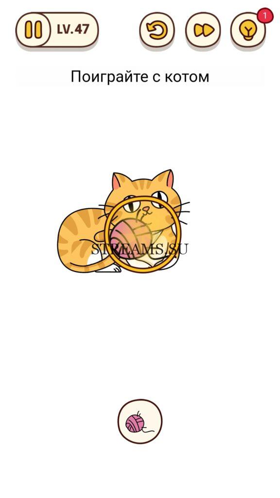 Поиграйте с котом. Уровень 47 — Brain Find – игра для любителей подумать над интересными задачами, ответ на этот уровень находится чуть ниже. Нужно включить собственное остроумие. Эта игра дает возможность увидеть множество локаций и разгадать бесконечное количество ребусов. Каждый отличается друг от друга. Создатели игры – «Focus apps» вложили не только материальные средства, но и всю любовь к игрокам. Ведь в приложении достаточно совершенная прорисовка, радующая глаз. Главным преимуществом является поддержка как Android так и IOS. Нередко бывает, что человек, проходящий уровень, не способен его решить (задача слишком сложна или непонятна). Наш сайт с ответами поможет игроку достичь вершин рейтинга и заполучить все бонусы.