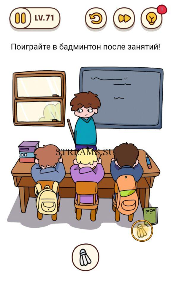 Поиграйте в бадминтон после занятий! Уровень 71 — Brain Find – уникальная игра в жанре «головоломка», ответ находится чуть ниже. Она имеет множество уровней и подуровней, которые весело проходить, без особых усилий и траты нервов. Игра нравится многим пользователям из-за приятного музыкального ряда, сопровождающегося весь игровой процесс. Тонко выполненной анимации и красивой графики, над которой поработали разработчики и вложили душу. Уникальность проекта состоит в том, что можно поворачивать экран на некоторых заданиях, увеличивать громкость динамика. То есть, всецело взаимодействовать не только с дисплеем, но и со всем мобильным устройством. На данный момент таких игр мало и не все они доступны в бесплатной версии! Brain Find переведена на русский язык. На нашем сайте, можно получить подсказки, если не получается пройти дальше.