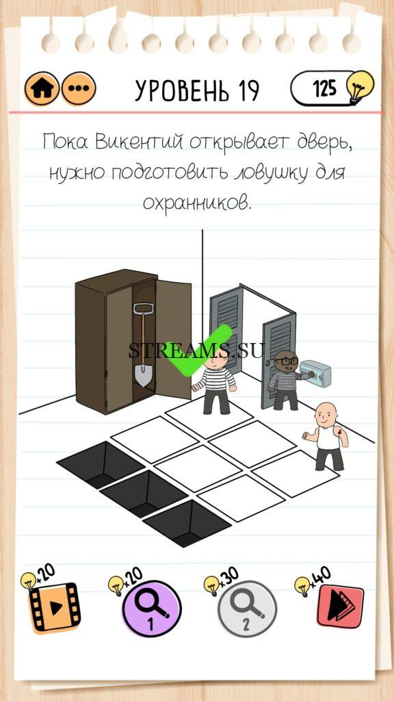 Пока Викентий открывает дверь, нужно подготовить ловушку для охранников. Уровень 19 — Brain Test 2 (Побег из тюрьмы): Вторая часть замечательной игры уже здесь. Готовы к испытанию своего мозга на прочность? Тогда смело залетайте в эту головоломку. Здесь нас ждет непредсказуемые задачки, вопросы и головоломки, которые сразу и не получиться решить. Будьте готовы к вопросам с подвохом! Попробуйте решить все уровни. Эта головоломка построена по принципу историй. В каждой истории придется помогать кому-то решить бытовые вопросы; вычислить преступника; помочь похудеть. Это лишь некоторые эпизоды которые нас ожидают в этой игре. Очень красочная игра, которая понравится и вам и вашим друзьям. Если не получается пройти загадку, то на нашем сайте STREAMS.SU вы найдете решение любого уровня Brain Test 2!
