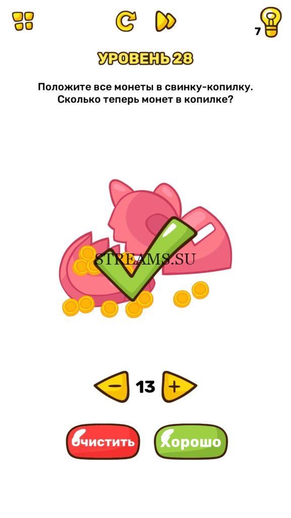 Положите все монеты в свинку-копилку. Сколько теперь монет в копилке? Уровень 28 — Brain Blow: Тест на гениальность — Ответ на этот уровень находится под фото. Очередная игра от популярных разработчиков головоломок CASUAL AZUR GAMES. Если вы хотите взорвать свой мозг и развить навыки нестандартного мышления, тогда игра Брейн Блоу определенно вам понравится. Если не получается решить задание, то попробуйте включить нестандартное мышление, тряхнуть телефон, погладить его или использовать больше пальцев. Эта игра способна развить в вас навыки следопыта, креативность и прокачать ваш IQ. Но, а если все-же не получается пройти уровень, найдите правильное решение на нашем сайте.