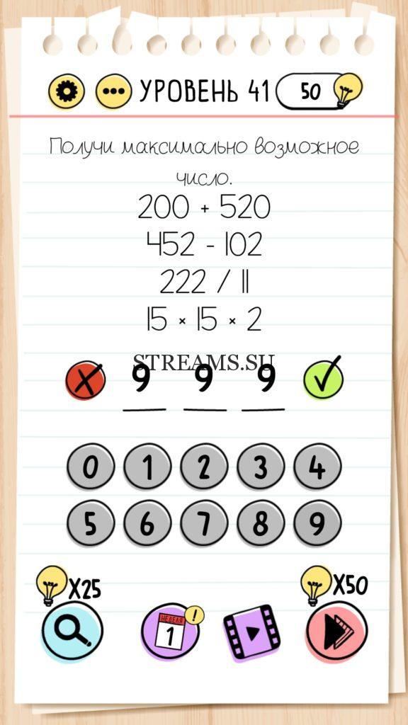 Получи максимально возможное число. Уровень 41 — Brain Test — Это самая популярная головоломка, в которой вам предстоит разгадывать непростые задачки. Нужно будет искать нестандартные решения. Название игры говорит само за себя (Тест мозга). С её помощью вы сможете повысить свой IQ, и интеллект. Иногда ответ может быть очень прост. Вы можете играть в компании друзей или родных. Брейн Тест, это отличный способ провести время с пользой и узнать насколько ты умный. Но если вы не можете решить один или несколько уровней, то воспользуйтесь подсказками с нашего сайта.