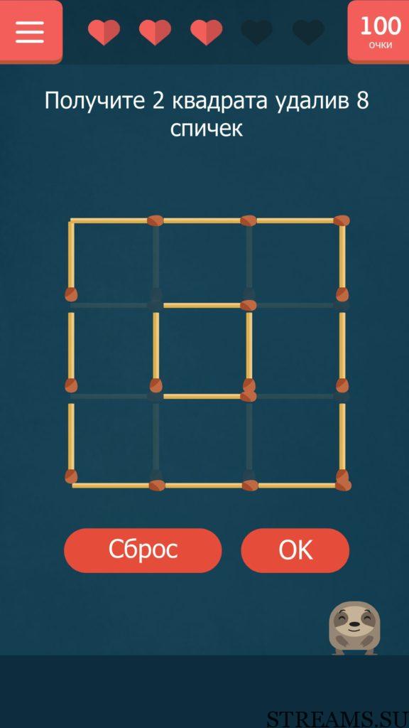 Получите 2 квадрата удалив 8 спичек. 46 уровень Каверзный тест (Tricky test) — игра от разработчиков студии NatGames. Если вам надоели наивные и простые задачки и головоломки, то эта игра определенно для вас! Нужно будет трясти, переворачивать, гладить свой телефон, чтобы пройти уровень. В описании игры написано, что 94% скачавших, не пройдут игру с первого раза. Чтобы исправить этот процент в меньшую сторону, мы предоставляем вам ответы на все уровни игры.