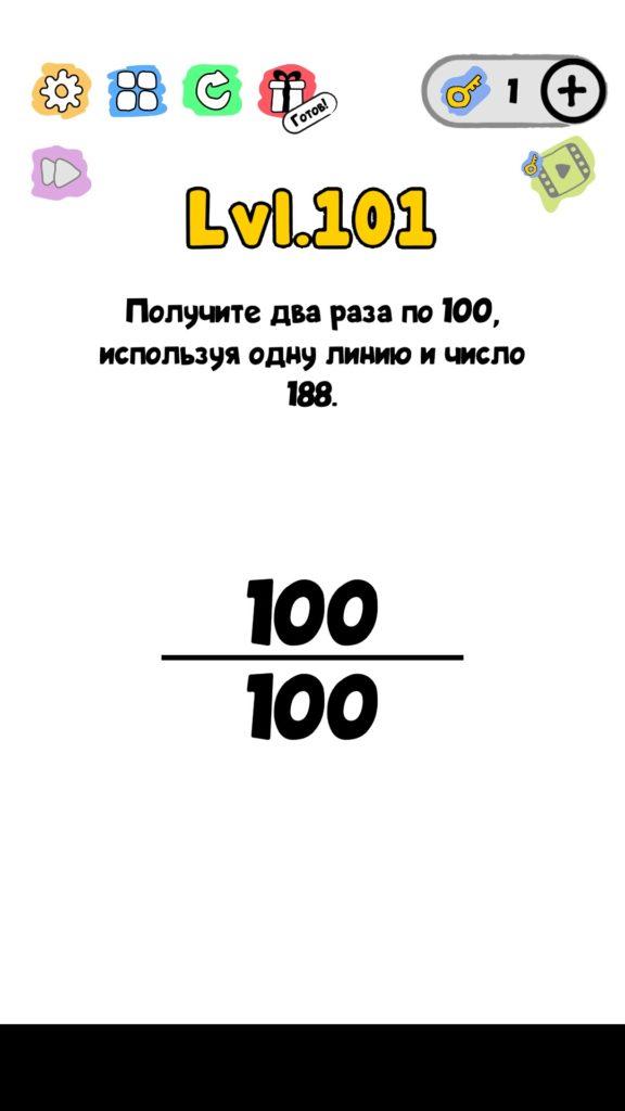 Получите два раза по 100, используя одну линию и число 188. 101 уровень Trick Me: логические головоломки — Это игра созданная в виде викторины. Каждый новый уровень отличается от предыдущего, что делает игровой процесс затягивающим и интересным. Если ты хочешь узнать насколько ты умный, тогда эта игра точно для тебя! Trick Me поможет тебе развить нестандартное мышление, и повысить свой IQ. В этой игре уже есть 236 уровней, которые постоянно обновляются и пополняются. Но если застрял на одном или нескольких уровнях, и не можешь их пройти, то наш сайт придет на помощь, у нас есть все ответы на уровни игры Trick Me.
