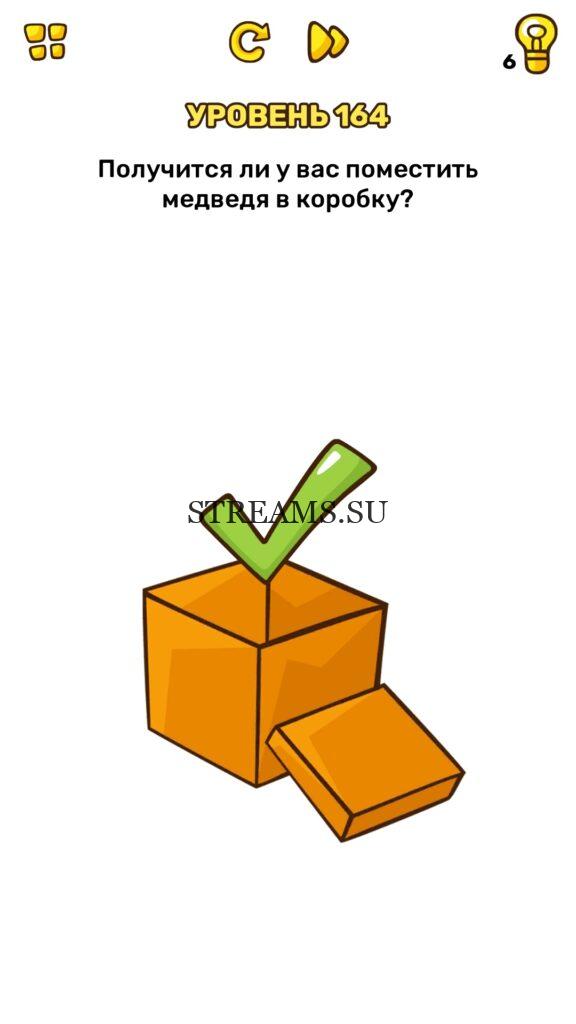 Получится ли у вас поместить медведя в коробку? Уровень 164 — Brain Blow: Тест на гениальность — Ответ на этот уровень находится под фото. Очередная игра от популярных разработчиков головоломок CASUAL AZUR GAMES. Если вы хотите взорвать свой мозг и развить навыки нестандартного мышления, тогда игра Брейн Блоу определенно вам понравится. Если не получается решить задание, то попробуйте включить нестандартное мышление, тряхнуть телефон, погладить его или использовать больше пальцев. Эта игра способна развить в вас навыки следопыта, креативность и прокачать ваш IQ. Но, а если все-же не получается пройти уровень, найдите правильное решение на нашем сайте.