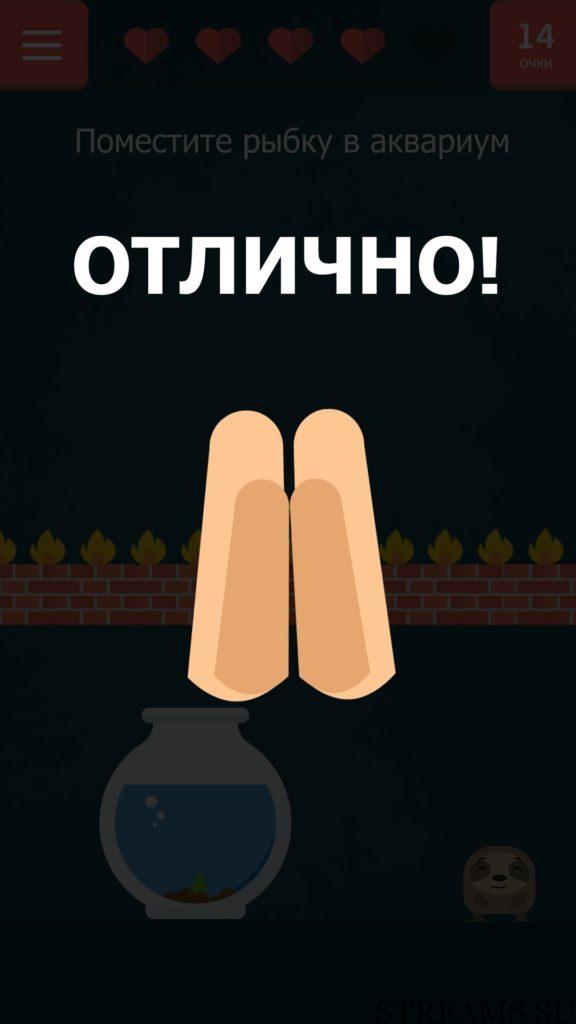 Поместите рыбку в аквариум. 3 уровень Каверзный тест (Tricky test) — игра от разработчиков студии NatGames. Если вам надоели наивные и простые задачки и головоломки, то эта игра определенно для вас! Нужно будет трясти, переворачивать, гладить свой телефон, чтобы пройти уровень. В описании игры написано, что 94% скачавших, не пройдут игру с первого раза. Чтобы исправить этот процент в меньшую сторону, мы предоставляем вам ответы на все уровни игры.