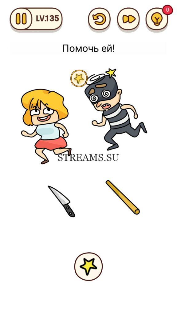 Помочь ей! Уровень 135 — Brain Find – уникальная игра в жанре «головоломка», ответ находится чуть ниже. Она имеет множество уровней и подуровней, которые весело проходить, без особых усилий и траты нервов. Игра нравится многим пользователям из-за приятного музыкального ряда, сопровождающегося весь игровой процесс. Тонко выполненной анимации и красивой графики, над которой поработали разработчики и вложили душу. Уникальность проекта состоит в том, что можно поворачивать экран на некоторых заданиях, увеличивать громкость динамика. То есть, всецело взаимодействовать не только с дисплеем, но и со всем мобильным устройством. На данный момент таких игр мало и не все они доступны в бесплатной версии! Brain Find переведена на русский язык. На нашем сайте, можно получить подсказки, если не получается пройти дальше.