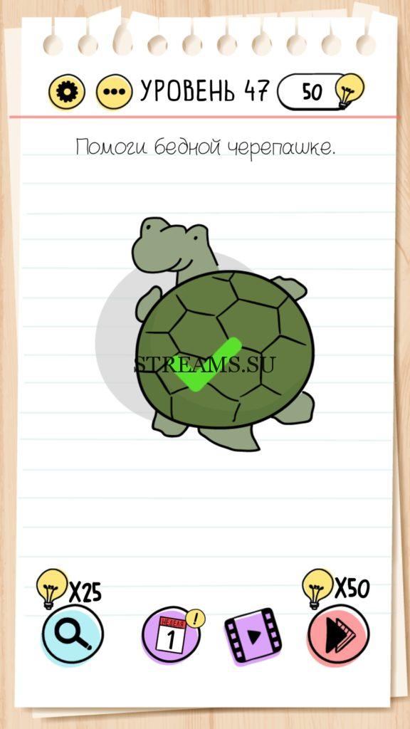 Помоги бедной черепашке. Уровень 47 — Brain Test — Это самая популярная головоломка, в которой вам предстоит разгадывать непростые задачки. Нужно будет искать нестандартные решения. Название игры говорит само за себя (Тест мозга). С её помощью вы сможете повысить свой IQ, и интеллект. Иногда ответ может быть очень прост. Вы можете играть в компании друзей или родных. Брейн Тест, это отличный способ провести время с пользой и узнать насколько ты умный. Но если вы не можете решить один или несколько уровней, то воспользуйтесь подсказками с нашего сайта.