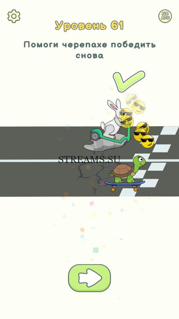 Помоги черепахе победить снова. Уровень 61 — DOP 2: Delete One Part. Вы готовы к продолжению первой части игры? Тогда вперед! Эта игра DOP 2 (Расшифровка: Delete One Part) , которая отличается от первой части тем, что здесь нам нужно будет не дорисовывать предметы, а удалять или стирать их. Вас ждет множество хитроумных и интересных уровней. На первом этапе нам будут подсказывать, что нужно удали, но потом становится всё тяжелее и тяжелее решать головоломки. Разработчики постарались сделать игру привлекательной. Геймплей заставит вас просидеть за игрой очень долго. Красивая графика исполнения. Тренировка мозга и многое другое, всё это ждет нас в замечательной головоломке DOP 2. Если не получается пройти уровень, или зашли в тупик, то вы можете найти ответ на любой уровень на нашем сайте STREAMS.SU! Ответ на этот уровень находиться чуть ниже..