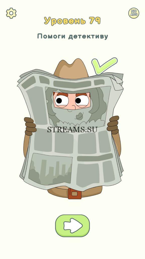 Помоги детективу. Уровень 79 — DOP 2: Delete One Part. Вы готовы к продолжению первой части игры? Тогда вперед! Эта игра DOP 2 (Расшифровка: Delete One Part) , которая отличается от первой части тем, что здесь нам нужно будет не дорисовывать предметы, а удалять или стирать их. Вас ждет множество хитроумных и интересных уровней. На первом этапе нам будут подсказывать, что нужно удали, но потом становится всё тяжелее и тяжелее решать головоломки. Разработчики постарались сделать игру привлекательной. Геймплей заставит вас просидеть за игрой очень долго. Красивая графика исполнения. Тренировка мозга и многое другое, всё это ждет нас в замечательной головоломке DOP 2. Если не получается пройти уровень, или зашли в тупик, то вы можете найти ответ на любой уровень на нашем сайте STREAMS.SU! Ответ на этот уровень находиться чуть ниже..