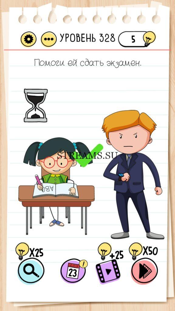 Помоги ей сдать экзамен. Уровень 328 — Brain Test — Это самая популярная головоломка, в которой вам предстоит разгадывать непростые задачки. Нужно будет искать нестандартные решения. Название игры говорит само за себя (Тест мозга). С её помощью вы сможете повысить свой IQ, и интеллект. Иногда ответ может быть очень прост. Вы можете играть в компании друзей или родных. Брейн Тест, это отличный способ провести время с пользой и узнать насколько ты умный. Но если вы не можете решить один или несколько уровней, то воспользуйтесь подсказками с нашего сайта.