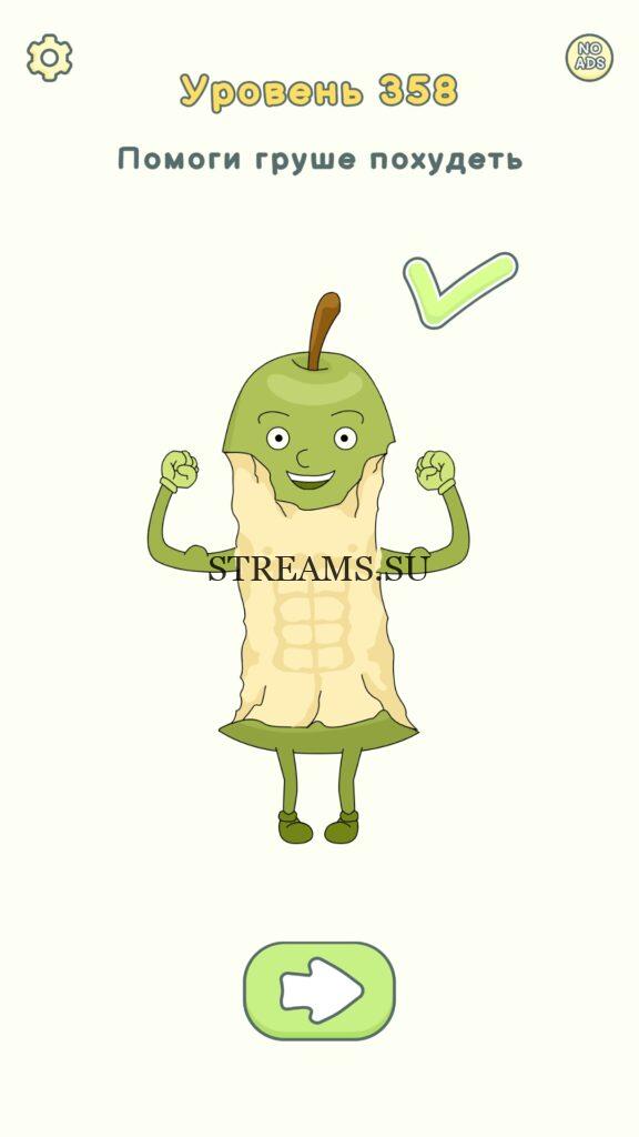 Помоги груше похудеть. Уровень 358 — DOP 2: Delete One Part. Вы готовы к продолжению первой части игры? Тогда вперед! Эта игра DOP 2 (Расшифровка: Delete One Part) , которая отличается от первой части тем, что здесь нам нужно будет не дорисовывать предметы, а удалять или стирать их. Вас ждет множество хитроумных и интересных уровней. На первом этапе нам будут подсказывать, что нужно удали, но потом становится всё тяжелее и тяжелее решать головоломки. Разработчики постарались сделать игру привлекательной. Геймплей заставит вас просидеть за игрой очень долго. Красивая графика исполнения. Тренировка мозга и многое другое, всё это ждет нас в замечательной головоломке DOP 2. Если не получается пройти уровень, или зашли в тупик, то вы можете найти ответ на любой уровень на нашем сайте STREAMS.SU! Ответ на этот уровень находиться чуть ниже..