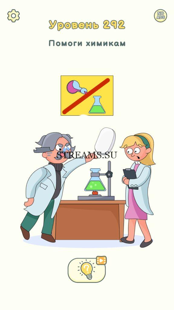 Помоги химикам. Уровень 292 — DOP 2: Delete One Part. Вы готовы к продолжению первой части игры? Тогда вперед! Эта игра DOP 2 (Расшифровка: Delete One Part) , которая отличается от первой части тем, что здесь нам нужно будет не дорисовывать предметы, а удалять или стирать их. Вас ждет множество хитроумных и интересных уровней. На первом этапе нам будут подсказывать, что нужно удали, но потом становится всё тяжелее и тяжелее решать головоломки. Разработчики постарались сделать игру привлекательной. Геймплей заставит вас просидеть за игрой очень долго. Красивая графика исполнения. Тренировка мозга и многое другое, всё это ждет нас в замечательной головоломке DOP 2. Если не получается пройти уровень, или зашли в тупик, то вы можете найти ответ на любой уровень на нашем сайте STREAMS.SU! Ответ на этот уровень находиться чуть ниже..