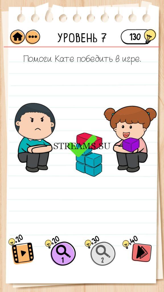 Помоги Кате победить в игре. Уровень 7 — Brain Test 2 (Семья Всезнайкиных): Вторая часть замечательной игры уже здесь. Готовы к испытанию своего мозга на прочность? Тогда смело залетайте в эту головоломку. Здесь нас ждет непредсказуемые задачки, вопросы и головоломки, которые сразу и не получиться решить. Будьте готовы к вопросам с подвохом! Попробуйте решить все уровни. Эта головоломка построена по принципу историй. В каждой истории придется помогать кому-то решить бытовые вопросы; вычислить преступника; помочь похудеть. Это лишь некоторые эпизоды которые нас ожидают в этой игре. Очень красочная игра, которая понравится и вам и вашим друзьям. Если не получается пройти загадку, то на нашем сайте STREAMS.SU вы найдете решение любого уровня Brain Test 2!