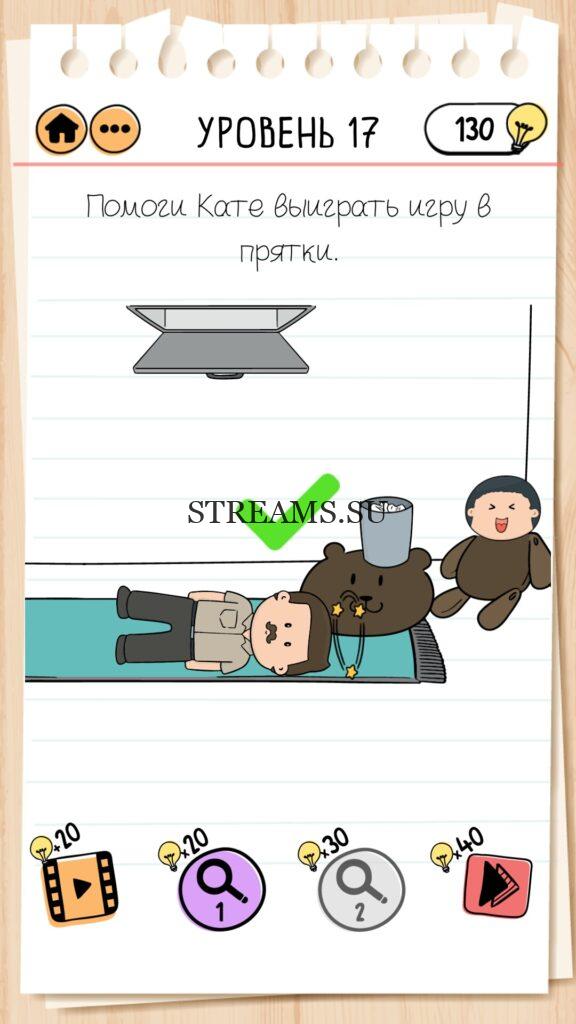 Помоги Кате выиграть игру в прятки. Уровень 17 — Brain Test 2 (Семья Всезнайкиных): Вторая часть замечательной игры уже здесь. Готовы к испытанию своего мозга на прочность? Тогда смело залетайте в эту головоломку. Здесь нас ждет непредсказуемые задачки, вопросы и головоломки, которые сразу и не получиться решить. Будьте готовы к вопросам с подвохом! Попробуйте решить все уровни. Эта головоломка построена по принципу историй. В каждой истории придется помогать кому-то решить бытовые вопросы; вычислить преступника; помочь похудеть. Это лишь некоторые эпизоды которые нас ожидают в этой игре. Очень красочная игра, которая понравится и вам и вашим друзьям. Если не получается пройти загадку, то на нашем сайте STREAMS.SU вы найдете решение любого уровня Brain Test 2!
