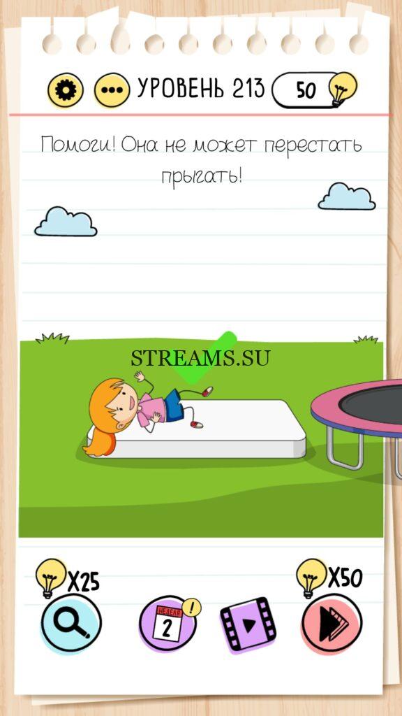 Помоги! Она не может перестать прыгать! Уровень 213 — Brain Test — Это самая популярная головоломка, в которой вам предстоит разгадывать непростые задачки. Нужно будет искать нестандартные решения. Название игры говорит само за себя (Тест мозга). С её помощью вы сможете повысить свой IQ, и интеллект. Иногда ответ может быть очень прост. Вы можете играть в компании друзей или родных. Брейн Тест, это отличный способ провести время с пользой и узнать насколько ты умный. Но если вы не можете решить один или несколько уровней, то воспользуйтесь подсказками с нашего сайта.