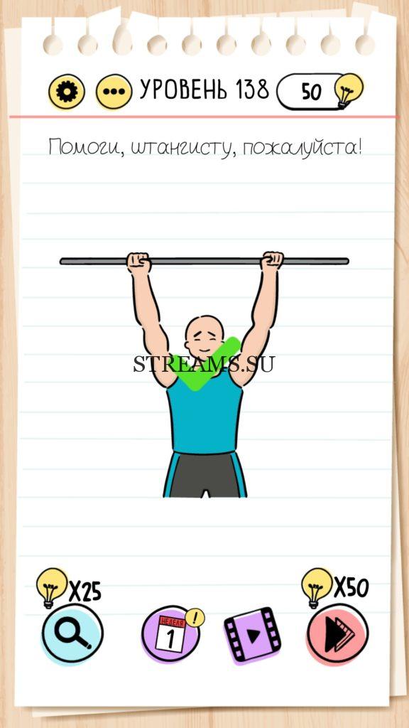 Помоги, штангисту, пожалуйста! Уровень 138 — Brain Test— Это самая популярная головоломка, в которой вам предстоит разгадывать непростые задачки. Нужно будет искать нестандартные решения. Название игры говорит само за себя (Тест мозга). С её помощью вы сможете повысить свой IQ, и интеллект. Иногда ответ может быть очень прост. Вы можете играть в компании друзей или родных. Брейн Тест, это отличный способ провести время с пользой и узнать насколько ты умный. Но если вы не можете решить один или несколько уровней, то воспользуйтесь подсказками с нашего сайта.