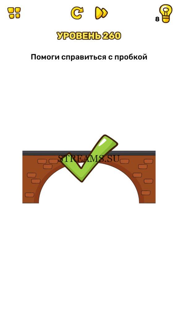 Помоги справиться с пробкой. Уровень 260 — Brain Blow: Тест на гениальность — Ответ на этот уровень находится под фото. Очередная игра от популярных разработчиков головоломок CASUAL AZUR GAMES. Если вы хотите взорвать свой мозг и развить навыки нестандартного мышления, тогда игра Брейн Блоу определенно вам понравится. Если не получается решить задание, то попробуйте включить нестандартное мышление, тряхнуть телефон, погладить его или использовать больше пальцев. Эта игра способна развить в вас навыки следопыта, креативность и прокачать ваш IQ. Но, а если все-же не получается пройти уровень, найдите правильное решение на нашем сайте.