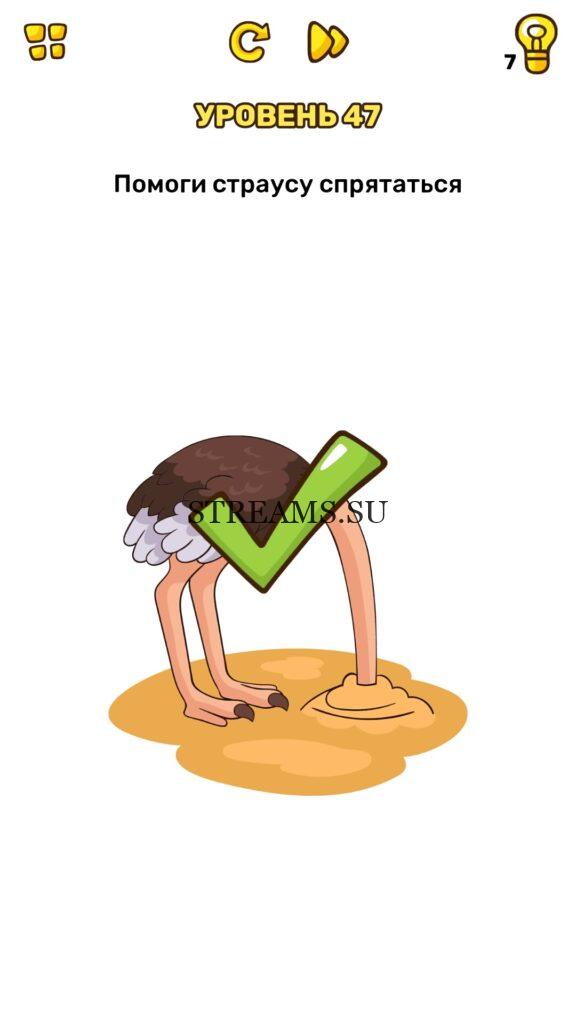 Помоги страусу спрятаться. Уровень 47 — Brain Blow: Тест на гениальность — Ответ на этот уровень находится под фото. Очередная игра от популярных разработчиков головоломок CASUAL AZUR GAMES. Если вы хотите взорвать свой мозг и развить навыки нестандартного мышления, тогда игра Брейн Блоу определенно вам понравится. Если не получается решить задание, то попробуйте включить нестандартное мышление, тряхнуть телефон, погладить его или использовать больше пальцев. Эта игра способна развить в вас навыки следопыта, креативность и прокачать ваш IQ. Но, а если все-же не получается пройти уровень, найдите правильное решение на нашем сайте.